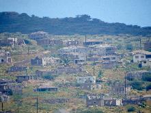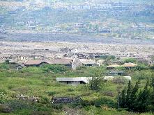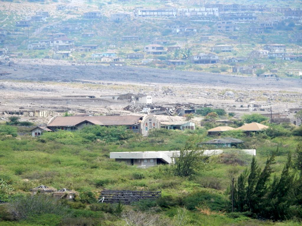 Die verwüstete Stadt Plymouth von weitem betrachtet. Sie liegt verlassen im Sperrgebiet.