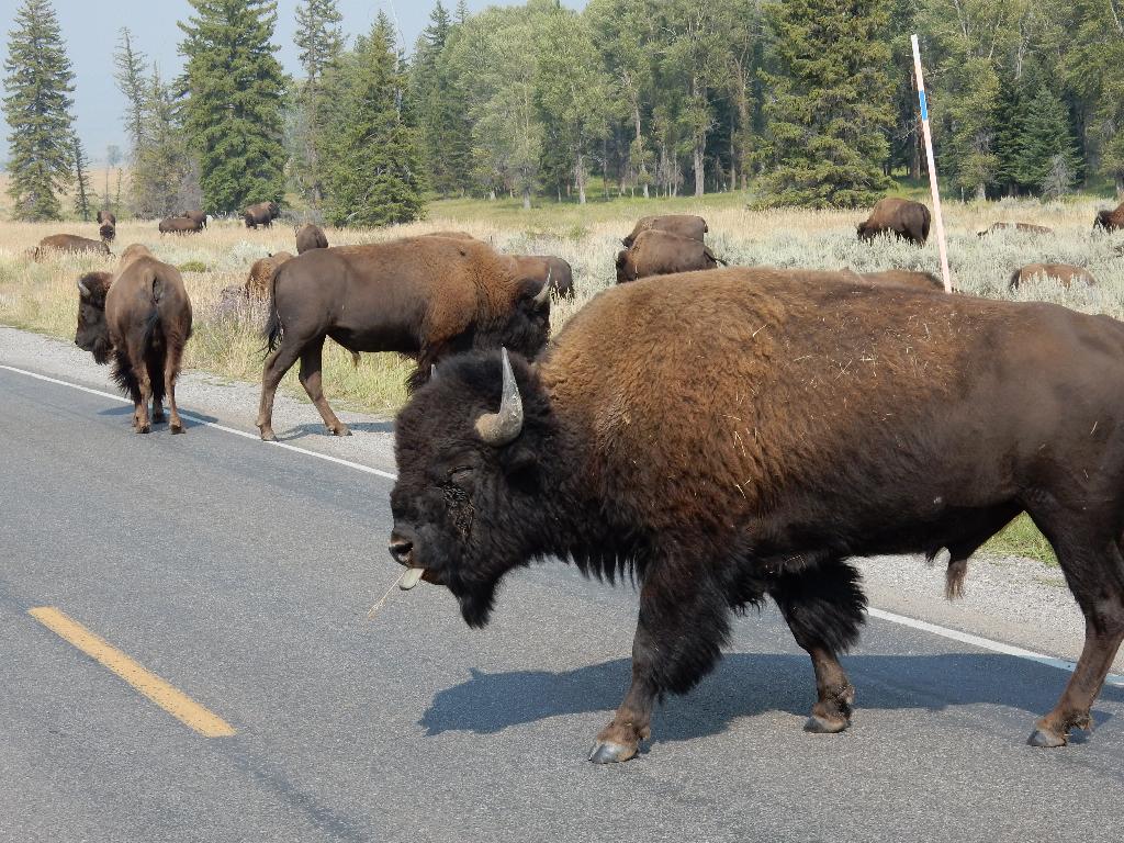Grand Teton Nationalpark - Die Bisons, Riesenbüffel, kommen nahe an uns heran. Ein Paradies für Wildtiere.